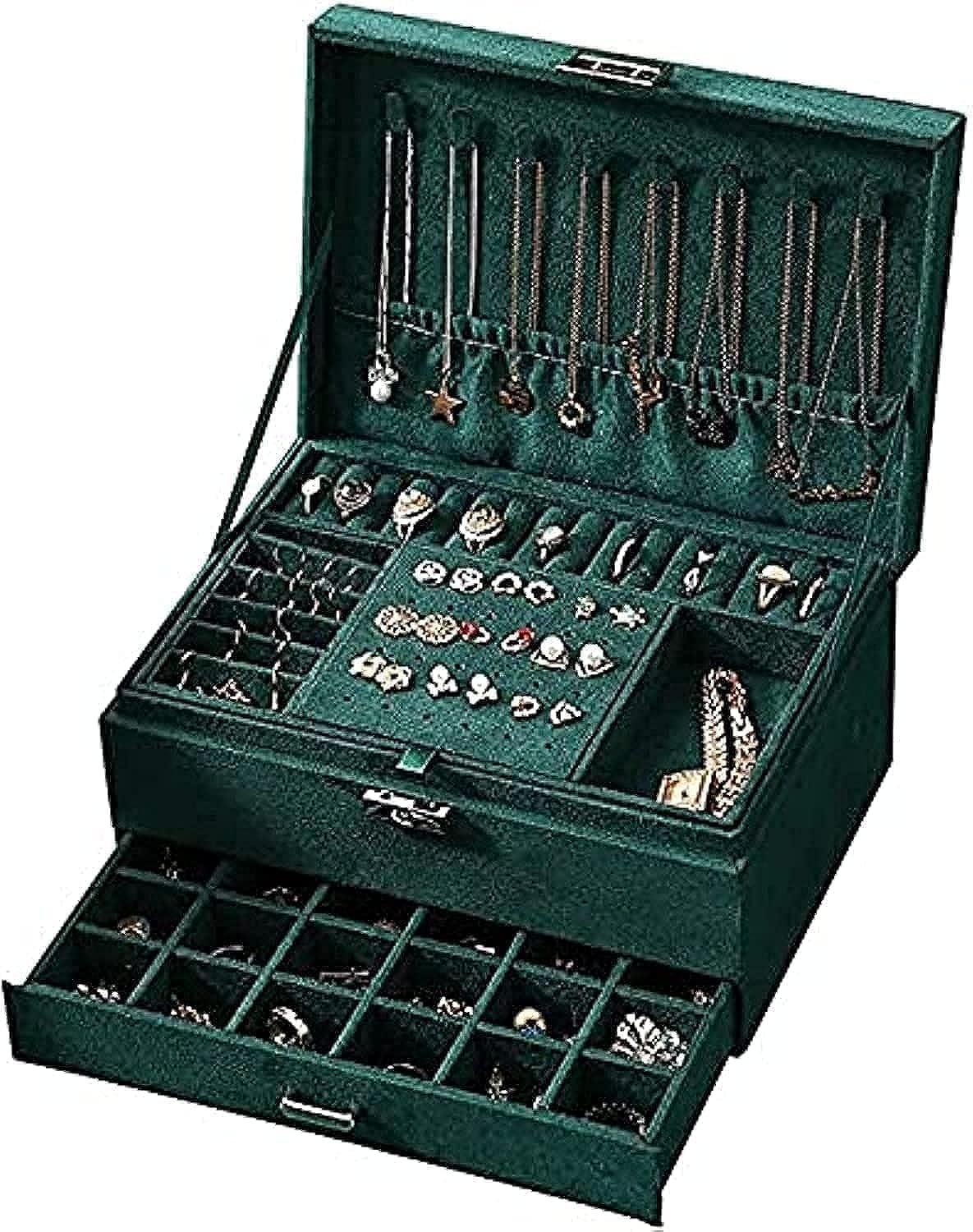 - [منظم مجوهرات رائع] منظم صندوق مجوهرات، العديد من المقصورات المخملية الكبيرة منظم تخزين المجوهرات مع قفل درج للنساء، حافظة عرض مجوهرات للنساء للأقراط والأساور والخواتم والقلائد والساعات