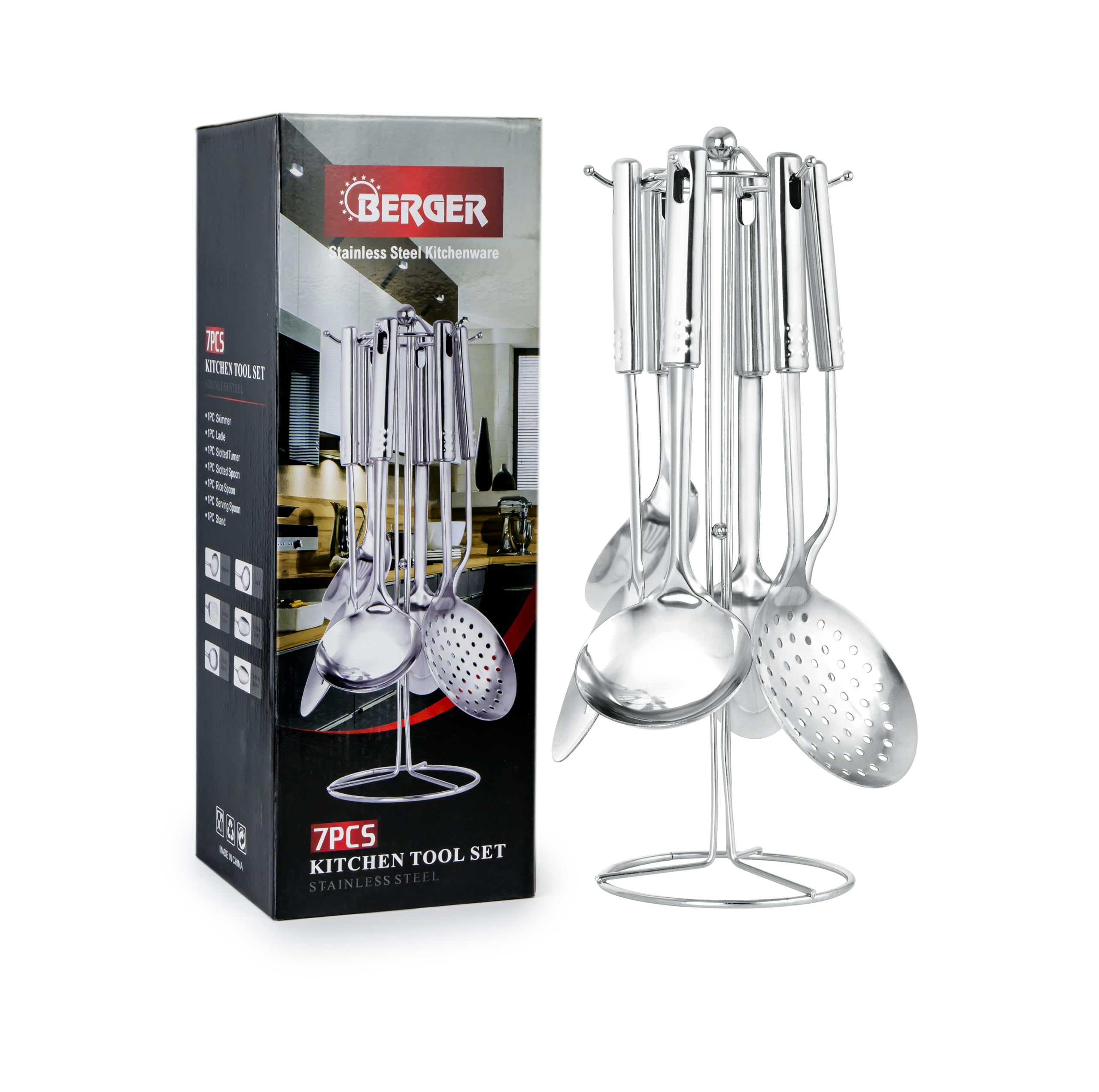 - مجموعة كاملة مع حامل: تتضمن 1 × ملعقة مقشفة، 1 × مغرفة، 1 × ملعقة تقديم، 1 × ملعقة تقليب مشقوقة، 1 × ملعقة مشقوقة، 1 × ملعقة أرز، 1 × حامل حامل. تحافظ على جميع أدوات المطبخ الأساسية في مكان واحد لسهولة الوصول إليها.