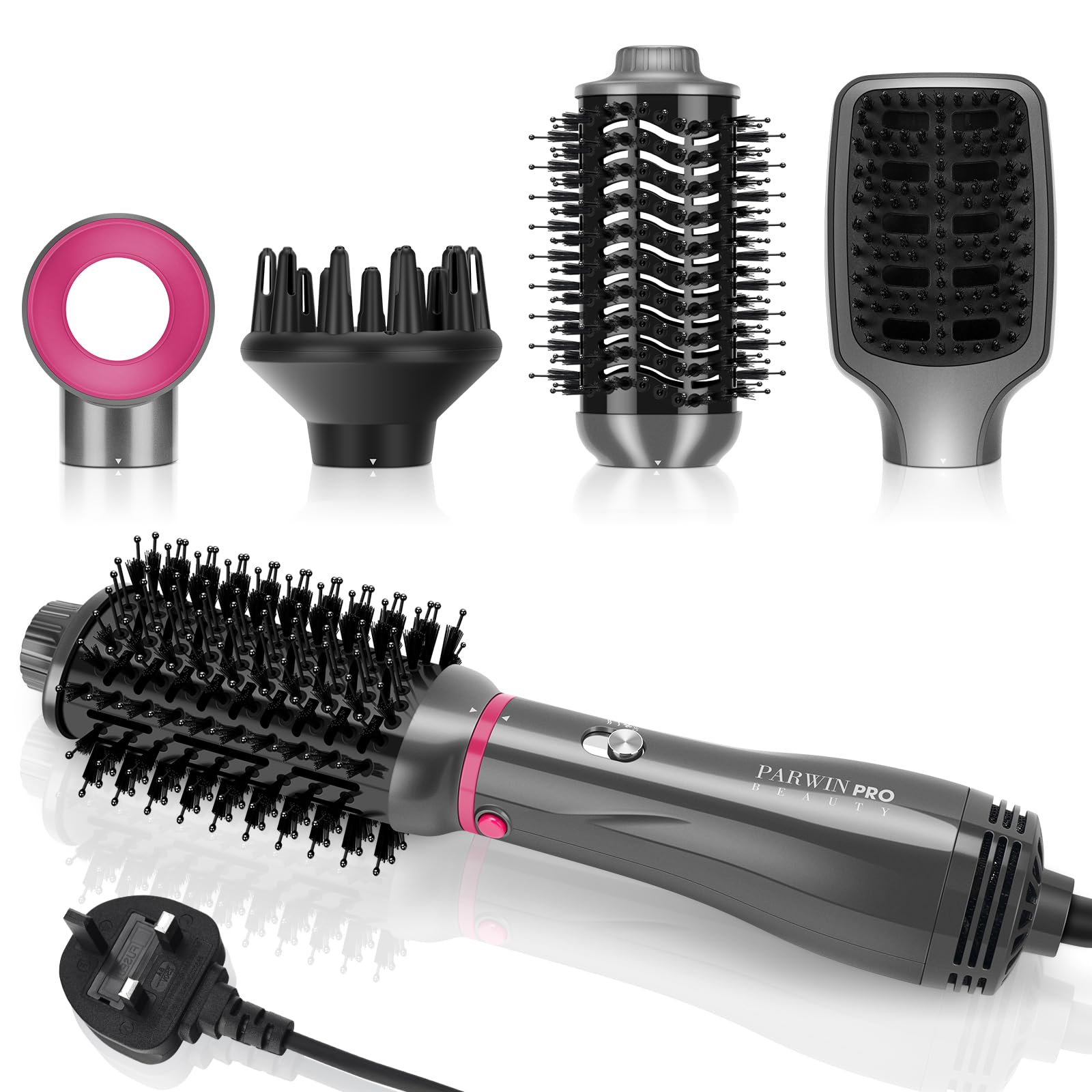 - ملحقات تصفيف قابلة للتبديل — تأتي مجموعة فرش الهواء الساخن هذه مع 4 ملحقات تصفيف، فقط اضغط على الزر الموجود على المقبض ويمكنك استبدال الملحق بسهولة. تلبي احتياجات الأنماط المختلفة، كما أنها أسهل في تنظيف ملحقات التصفيف. يمكن استخدام الجهاز كأدوات مختلفة لتصفيف الشعر، مثل مجفف الشعر المجعد ومجفف الشعر وفرشاة ساخنة ومجفف شعر موزع وفرشاة تمويج الشعر وما إلى ذلك.