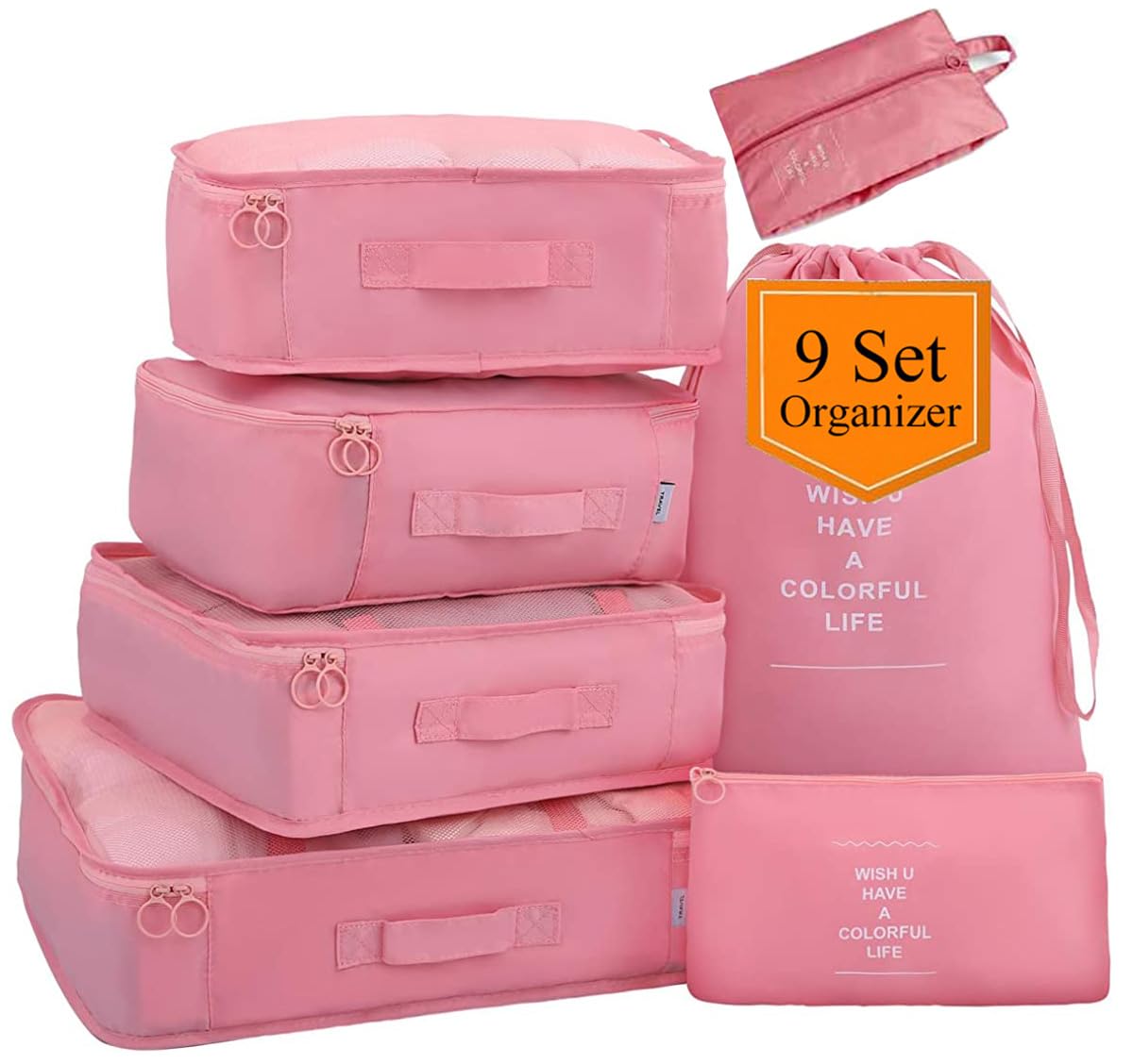 مجموعة من 9 قطع من منظم حقائب السفر، مجموعة مكعبات التعبئة، حقيبة تخزين مضغوطة مقاومة للماء، اكسسوارات السفر (بينك)