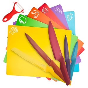 مجموعة سكاكين من كوافوك مع لوح تقطيع، مجموعة سكاكين مطبخ متعددة الالوان من الستانلس ستيل للطهاة والنحت والخبز والمرافق وسكاكين الفاكهة ومقشرة وألواح التقطيع