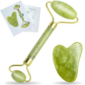 مجموعة مكافحة الشيخوخة ومدلك الوجه الدوار واداة حك وشد الوجه من حجر اليشم الطبيعي – ادوات تجميل للوجه عبر التدليك للحصول على وجه نحيف بلوحة جواشا مصنوعة من حجر طبيعي للعلاج بالساونا – قطعتين