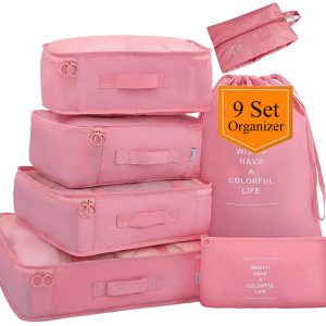 مجموعة من 9 قطع من منظم حقائب السفر، مجموعة مكعبات التعبئة، حقيبة تخزين مضغوطة مقاومة للماء، اكسسوارات السفر (بينك)